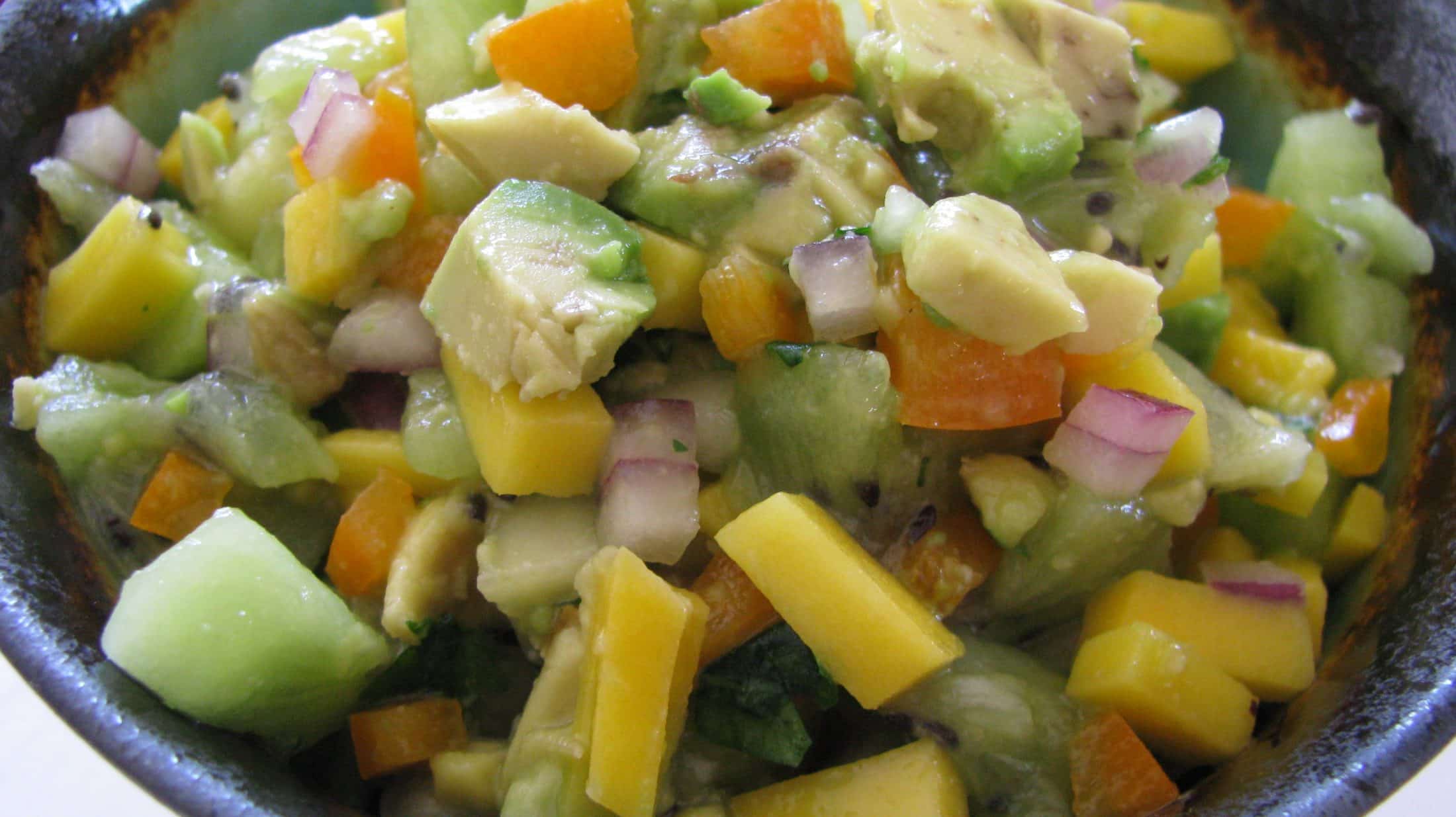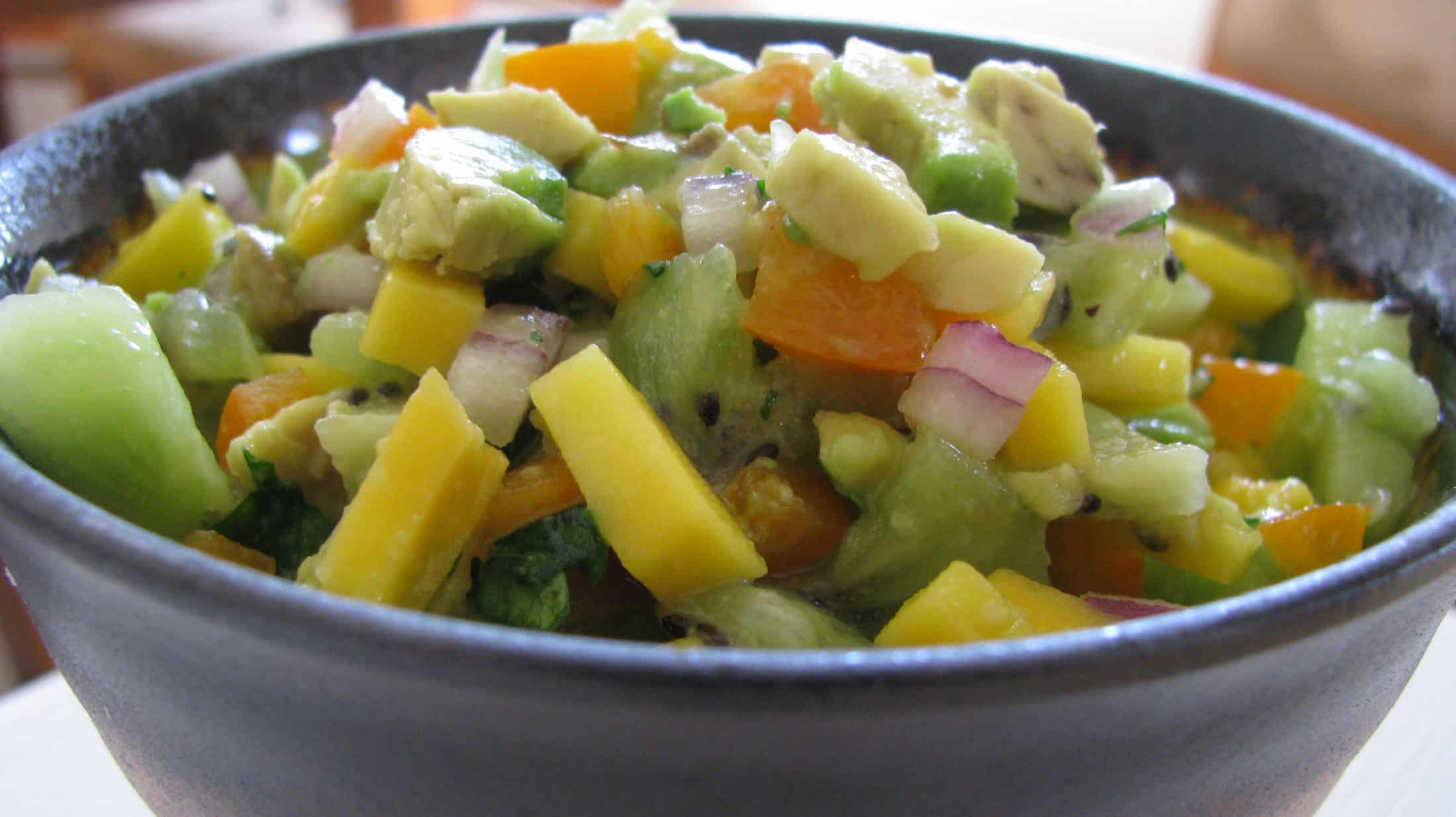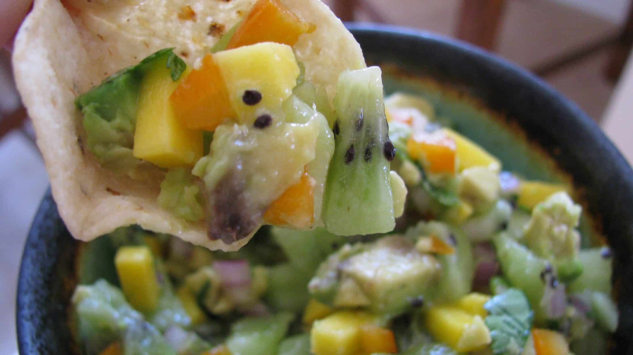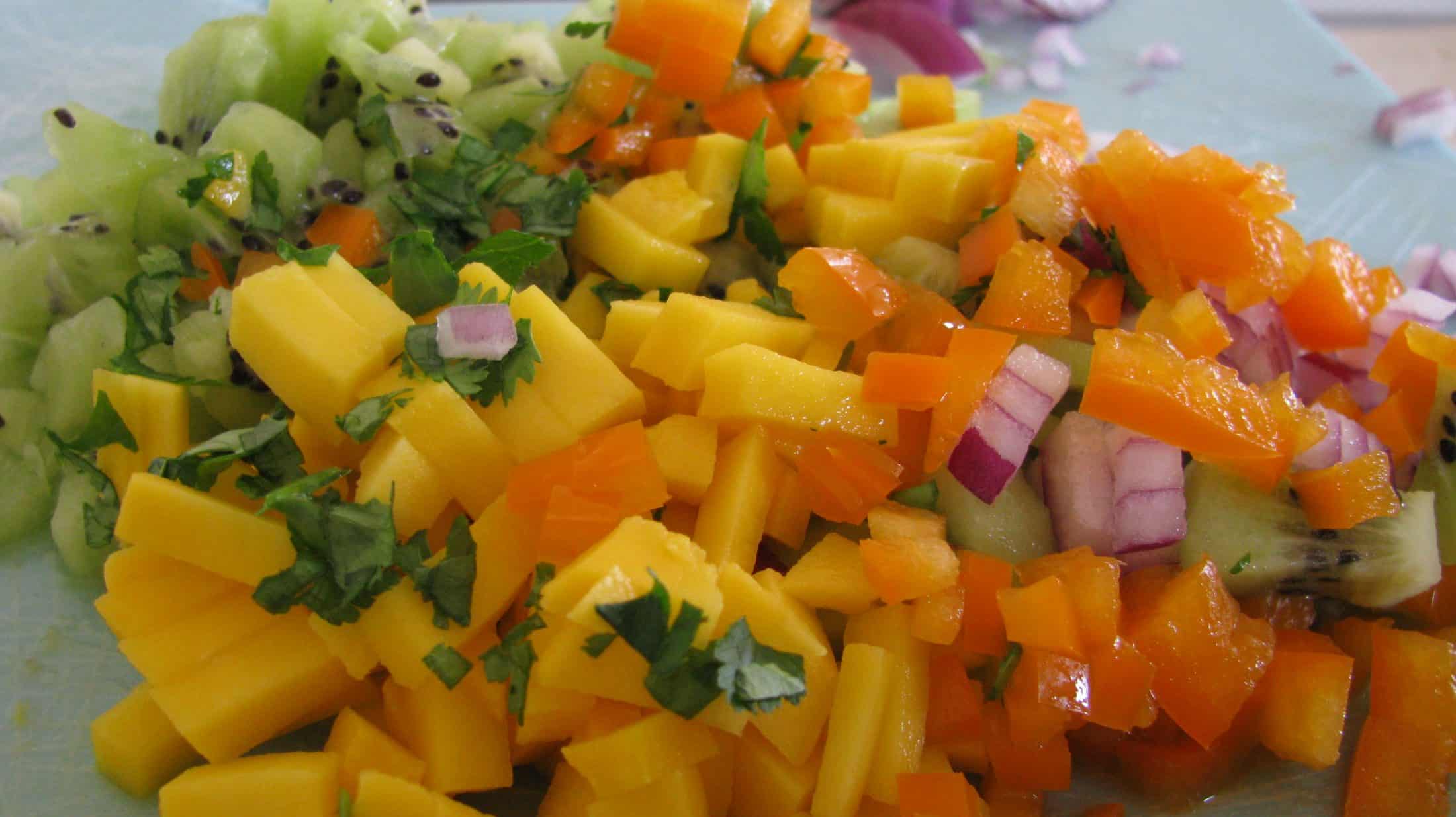 Into the mix went kiwi, mango, orange bell pepper, red onion, cilantro, avocado and lime juice.