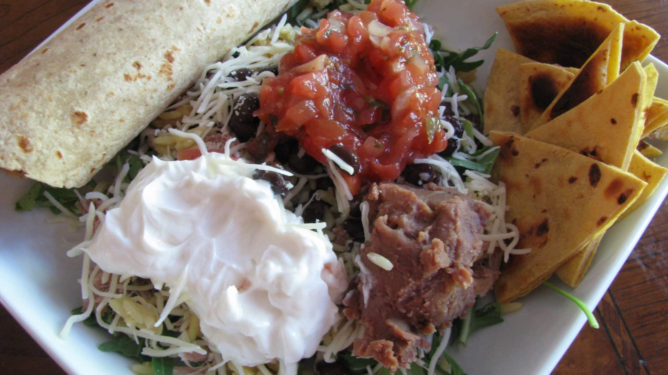 In the bowl: arugula, pulled pork, black beans, brown rice, fat-free refried beans, salsa, greek yogurt, avocado, and low-fat cheese. A tortilla on the side, as well as one toasted in the oven, cut into chips.