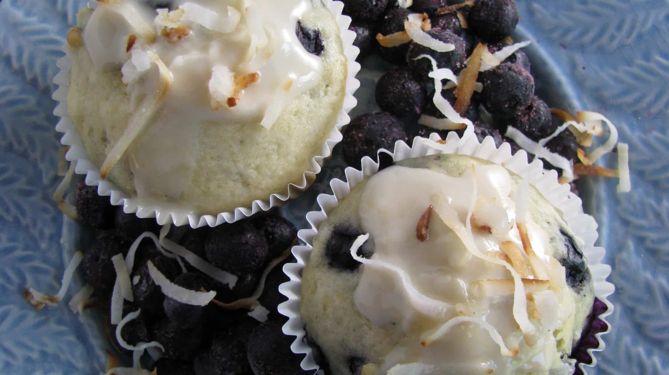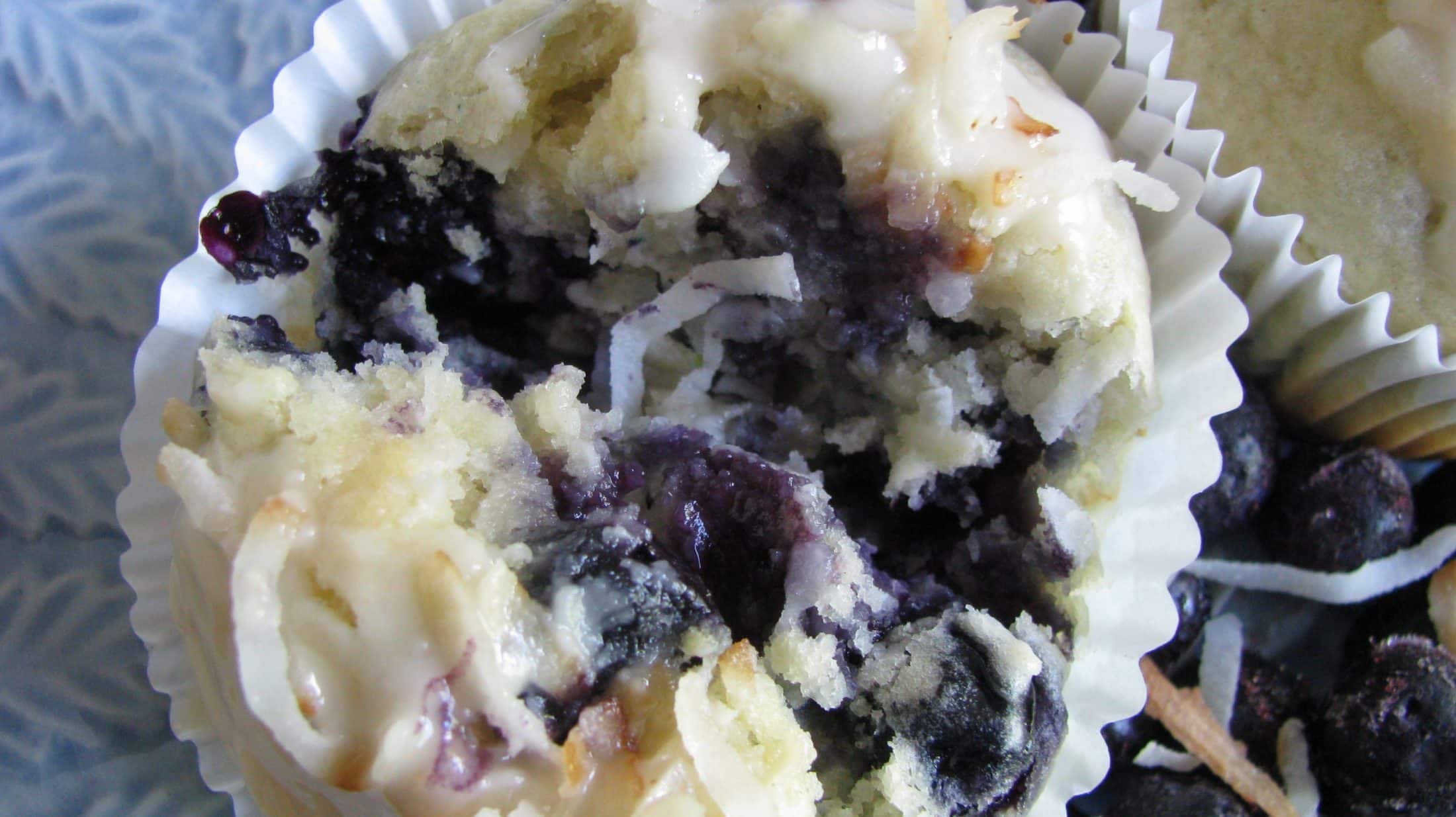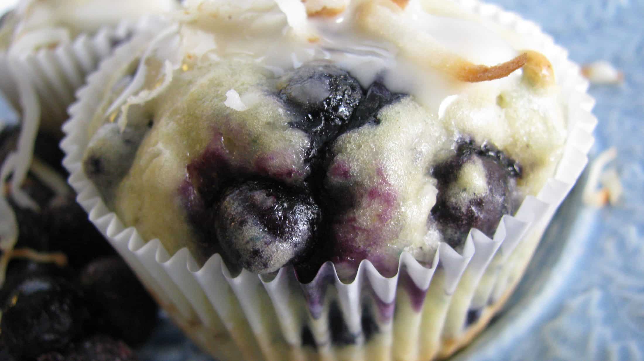 Mix flour, sugar, and baking powder in a large bowl. Add coconut oil, coconut milk, vanilla, and egg, and mix until combined. Fold in shredded coconut and blueberries. Top with a sprinkling of raw turbinado sugar.