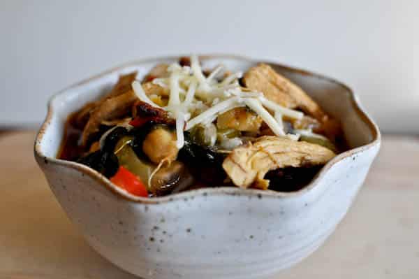 Once bacon is done, remove and drain on a paper towel. Keeping heat on medium, add onions, mushrooms and peppers to bacon grease and saute until soft, about 5-8 minutes. Add garlic, spinach, paprika and cumin and stir for 60 seconds. Turn heat down to low and add chickpeas, celery, carrots and chicken. Pour in chicken stock and simmer for 30 minutes.