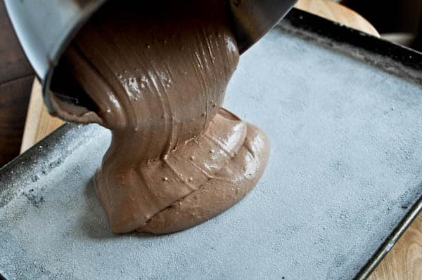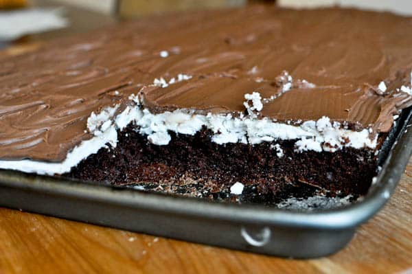 Preheat oven to 350. Prepare your favorite chocolate cake (I used a Devil’s Food boxed mix). Grease and flour a jelly roll pan. Pour batter in the pan and spread around until it’s even. Bake at 350 for 15-20 minutes; this will depend on the cake you bake, but begin to check it after 15 minutes.