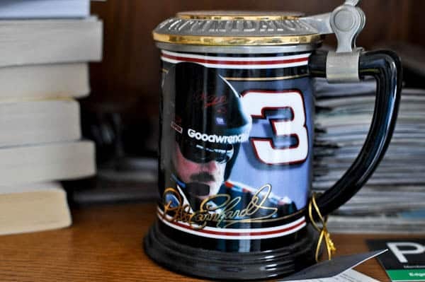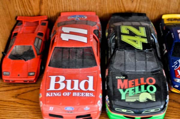I have NASCAR cars decorating my house. My husband picked out about 10 of them to display out of 4 totes (at least) of them. And sadly because we live in a small 2 bedroom we don’t have an extra room to hide them. They are “proudly” displayed in our hallway and even some in our living room tucked in the corner.