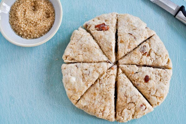 Divide in half and pat into 7 inch round circles. Brush with melted butter and sprinkle with coarse sugar. Cut into 6 or 8 wedges.