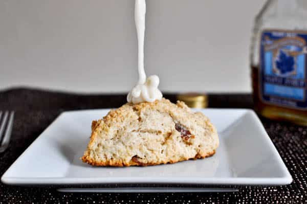 Combine syrup, vanilla and powdered sugar and stir until combined. Based on the consistency of the glaze, add water one drop at a time and stir – if you accidentally add too much, just add a bit more powdered sugar. Continue to stir until desired consistency is reached. Pour over scones!