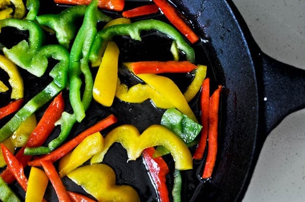 I think you should slice some peppers. Red, green, yellow, orange… you know, that sort of thing. Purple if you have them. Saute them in some olive oil. Because what good would they be if you didn’t? Really. They will get soft and sweet and juicy.