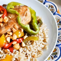 • When ready to cook, heat an oven-safe (I used cast iron) skillet on medium heat. Slice green, red and yellow peppers. Add 2 tablespoons olive oil to skillet and add peppers with a pinch of salt, reserving a few pepper slices. Stir and cook for 5 minutes. Push peppers to the side and turn heat up to medium high. Add chicken breasts and sear on each side until brown and crispy, about 5 minutes. After the second side has seared, top the chicken with reserved pepper slices and add the entire skillet to the oven uncovered. Bake for 25 minutes. Remove from over and immediately top with peanuts. Let sit for 5 minutes before serving.