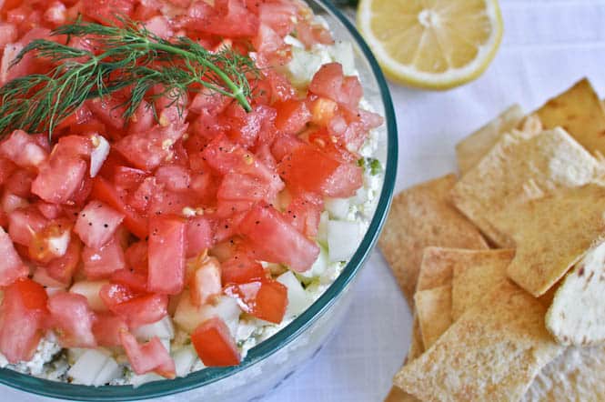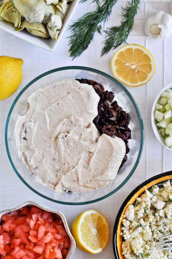 In a bowl, combine yogurt, dill, garlic, 3 tablespoons of cucumber, olive oil and a sprinkle of salt and pepper and mix. Grab a large bowl or plate and begin layering ingredients: the yogurt tzatziki, the chopped olives, the hummus, the chopped artichoke hearts, the crazy feta, and the tomatoes and cucumber. You can layer it however you’d like and use other ingredients to make it your own. I did sprinkle my cucumber and tomato with some salt and pepper for flavor, but the rest of the dip was VERY flavorful since I used the crazy feta. Serve with pita chips or use in wraps and sandwiches.