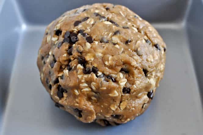 4. Make sure dough is completely combined, and roll it into a ball with your hands. Place it in the middle of an 8×8 baking dish, pressing it to fit. Bake for 18-20 minutes, or until set and golden on top. Let cool completely, then cut into 9 squares.