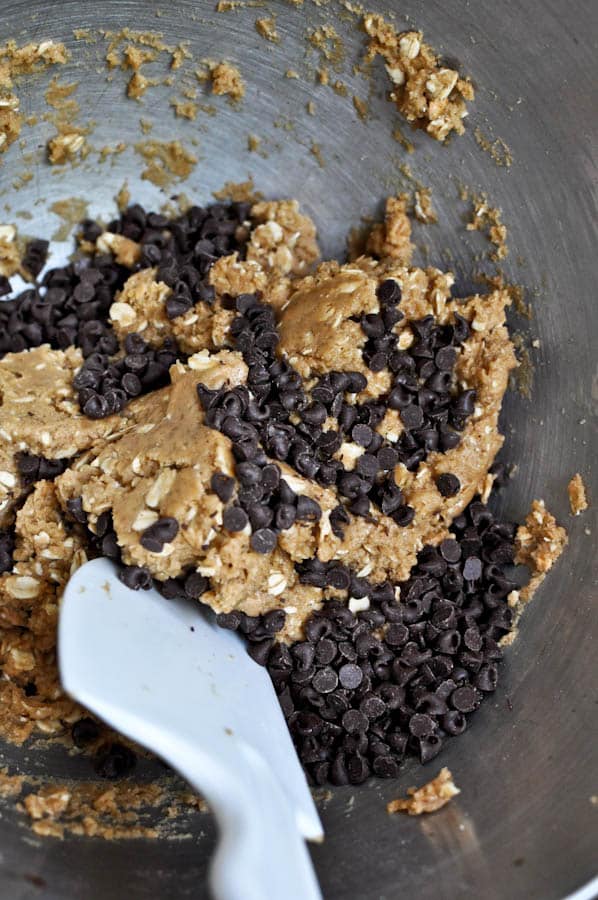 3. Add in flour, oats, salt and baking soda, mixing on medium speed. The dough will look crumbly and you want the peanut butter mix to be broken up into clumps. Add milk with the mixer on low speed, and mix until a dough forms. Fold in chocolate chips.