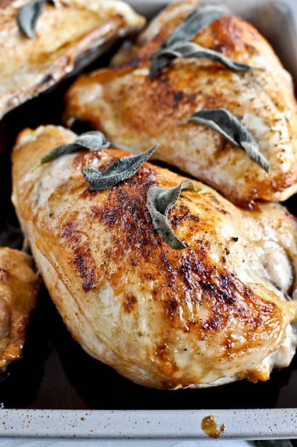 In a bowl, combine salt, pepper, paprika, onion and garlic powder. Heat a skillet over medium-high heat and add olive oil. Season chicken breasts on both sides with mixture, then place skin-side down in the skillet. Cook for 2-3 minutes, or until chicken is golden brown, then flip and repeat on the other side. When finished, add chicken to an oven-safe baking dish. Pour half of the glaze overtop of chicken, add sage leaves on top if desired, then roast for 30 minutes. Half way through cooking, brush chicken with a bit more glaze.