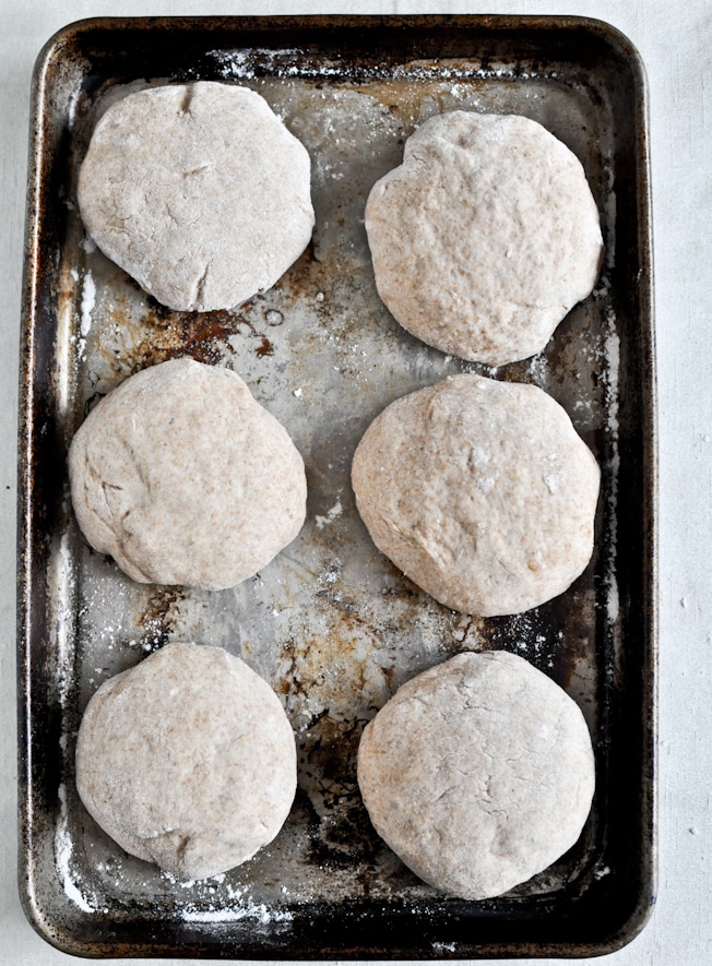Once risen, punch down the dough and knead a few times, adding a few spoonfuls of flour if sticky. Separate the dough into 6 or 8 pieces (it’s your call), then roll into a ball and place covered on a baking sheet to rise for another 10 minutes.