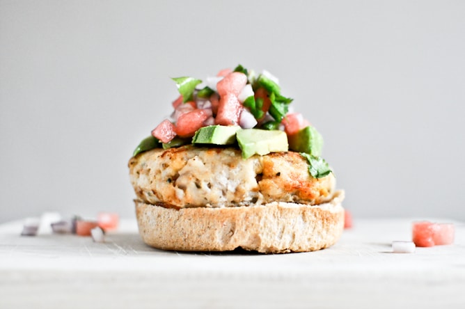 Tilapia Burgers with Watermelon Salsa + Avocado.