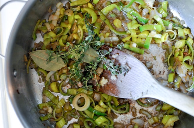 Heat another (or the same one, cleaned) large pot over medium high heat and add bacon. Cook until crispy and fat is rendered, then remove with a slotted spoon and place bacon on a paper towel to drain. Reduce heat on the pot to low, add butter, then add in onions and leeks with 1/2 teaspoon salt. Stir to coat, then cook for 5 minutes until softened. Add in garlic, thyme and bay leaves, stirring and cooking for another 5 minutes. Increase heat a bit and whisk in flour, stirring for 1-2 minutes to create somewhat of a roux with the vegetables.