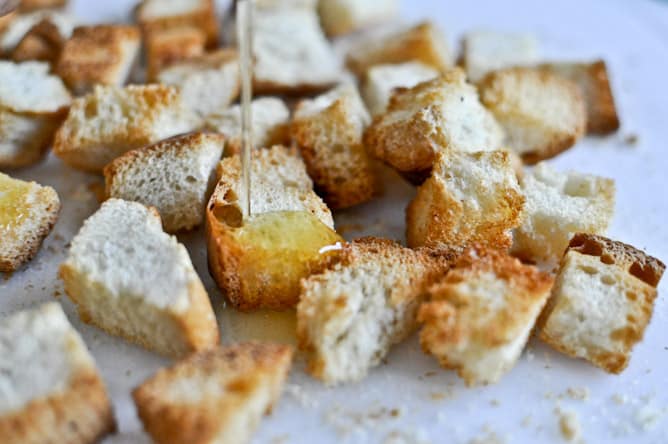 Preheat oven to 375 degrees F. Place bread cubes on a baking sheet. Baking for 10-12 minutes, tossing every 3 minutes until cubes are evenly golden.
