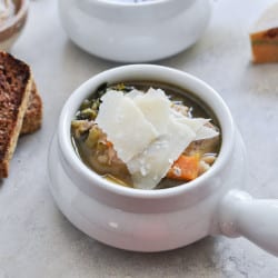 - Before serving soup, add in grated parmesan cheese and stir well. It is your choice if you’d like to stir in all of the brown butter at once or drop a few teaspoons in each bowl as it is served. I like to stir it in all at once – such great flavor. Top with a few extra shavings of parmesan.
