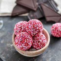 Needless to say, I would be super excited to receive some truffles, especially truffles made with RED WINE on Valentine’s Day. Especially if said truffles were covered in a trillion multicolored pink sprinkles that stain your entire life pink when touched. Really… your entire life. My hands and face were pink for days. Yes, I sort of loved it. I realize that I’ve been a bit heavy handed on the sprinkles this week, so you can rest assured that this is the end of the sprinkles. For the moment.