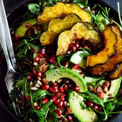- Add the arugula to a large bowl with a pinch of salt and pepper. Add in the avocado, pomegranate arils, cucumber, pecans and squash pieces. Cover in the pomegranate dressing.