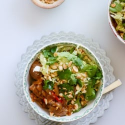 It’s just so freaking fantastic. I KNOW. Broken record. I can’t stop. The pork tenderloin cooks quickly (whereas I’m used to destroying pork tenderloins in the oven after waiting for an hour and 25 minutes), the sauce is delicious and the toppings are even better: my favorite napa cabbage, peanuts, tons of cilantro and lime.