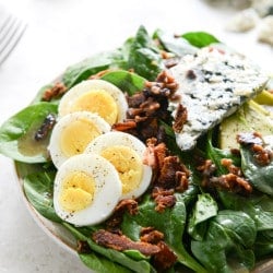 - To assemble the salads, pile your spinach on a plate and cover with the sliced hard boiled eggs, avocado and gorgonzola. Crumble on two slices of bacon and season with a bit of pepper if you’d like. I find that this salad doesn’t need a lot of salt since the components are so salty.