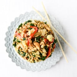 • Reduce the heat to low and stir in the soy sauce – if you are not using a low-sodium version, add a bit less and taste before adding more. Add the veggies and eggs back in, then stir in the cashews. Drizzle the toasted sesame oil over top and taste. Season additionally if desired. Serve immediately. This can be eaten alone or can serve as a great base for chicken, shrimp, pork or tofu!
