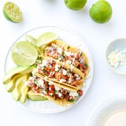 These tacos have a bit of that flavor, what with our own seasoning spices and all – but also have a little trendy taco truck taste too. The quick pico de gallo, crumbled queso freso and crema contribute to that.