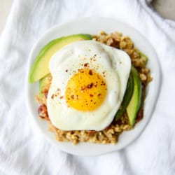 - Cook eggs as desired and season them with a tough of salt, pepper and crushed red pepper. Spoon the rice into a bowl or a plate and add the egg on top along with the sliced avocado. Finish with a sprinkle of chives and EAT!