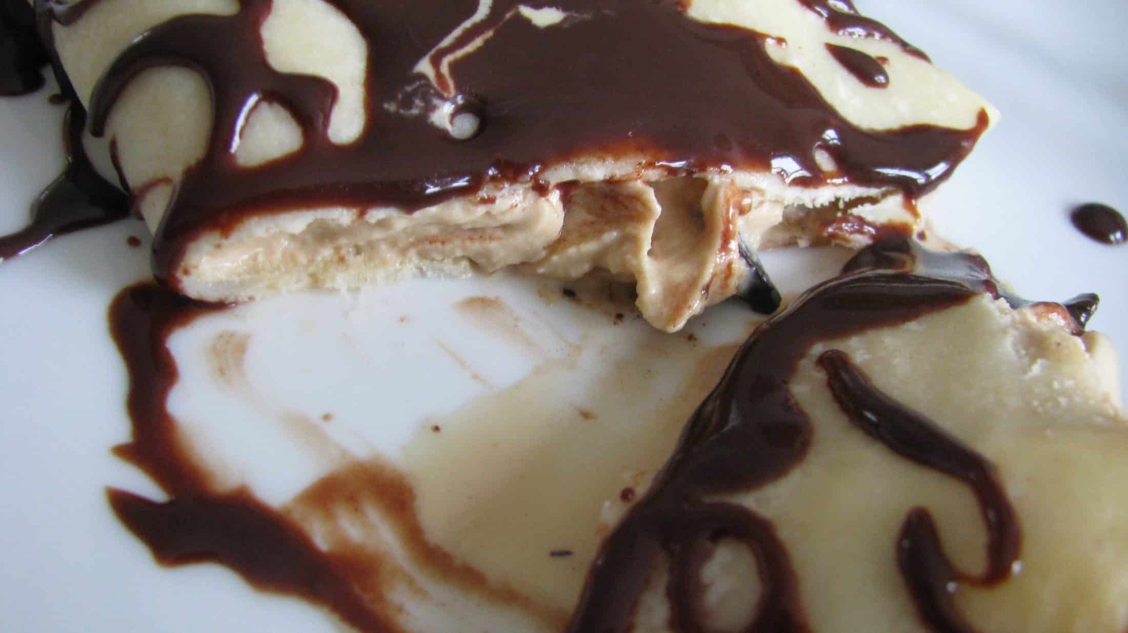 Coffee Ice Cream Crepes with Homemade Chocolate Fudge Sauce.