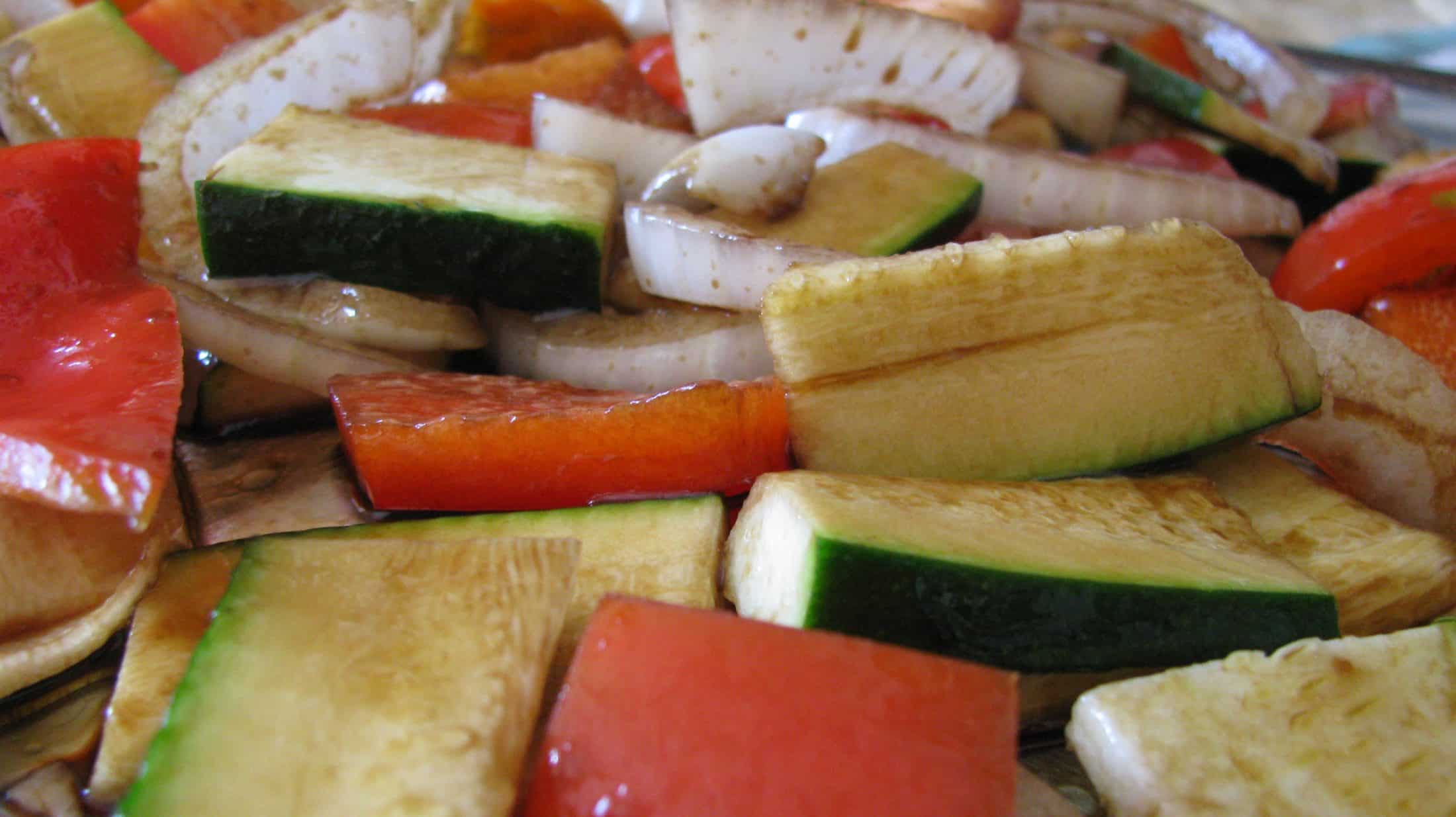 - Chop and slice veggies. Lay on a baking sheet and toss with salt, pepper, garlic powder, balsamic vinegar, and 2 tablespoons olive oil. Roast for 30 minutes, or until carmelized.