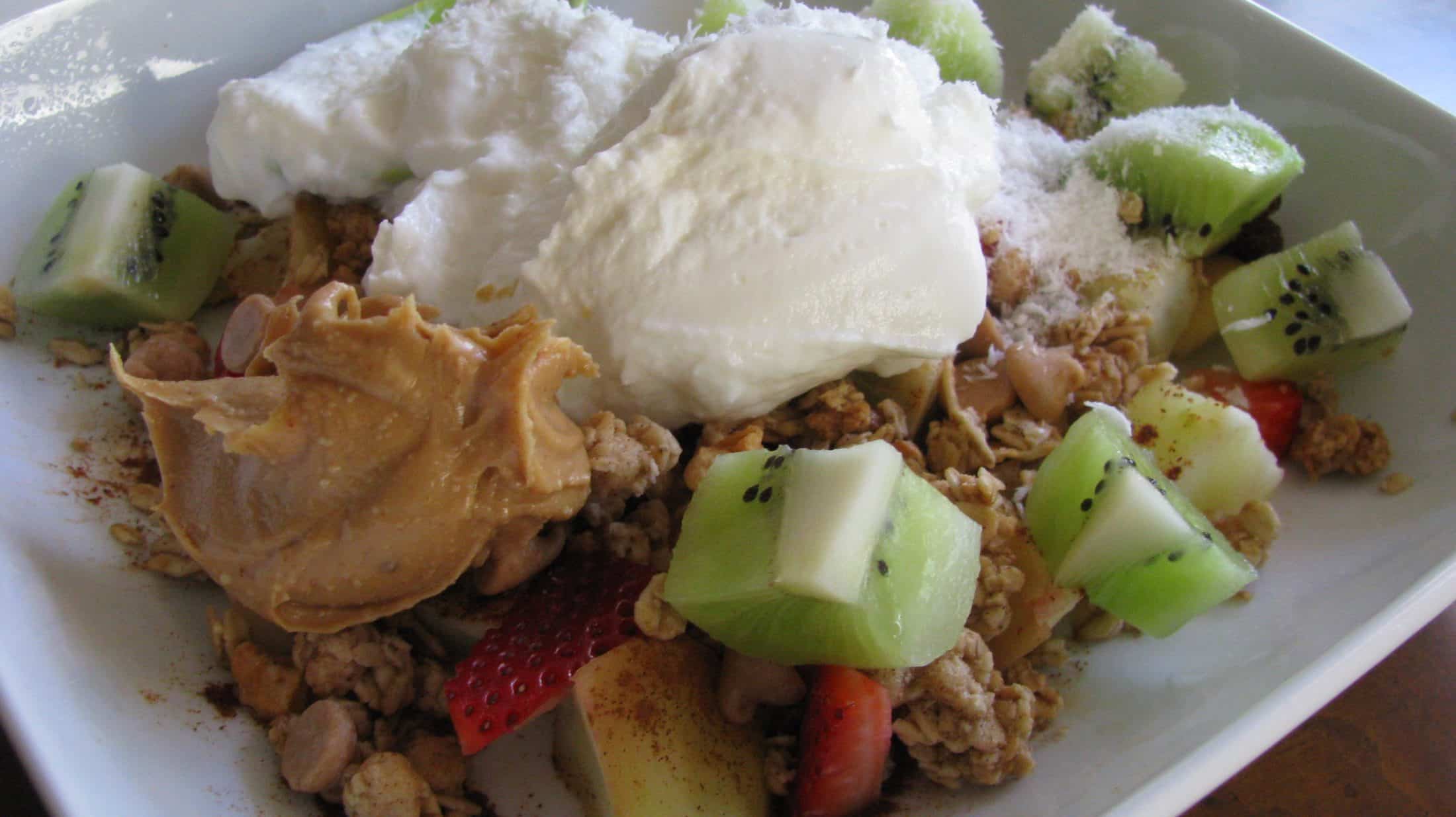 This is what is in my go-to bowl: 1 cup of plain, fat-free, greek yogurt, 1 microwaved apple with cinnamon, 1/2 cup chopped strawberries, 1 chopped kiwi, 1/2 cup of high-fiber cereal or granola, 1-2 tablespoons of coconut, 1-2 tablespoons of chocolate chips, and 1-2 tablespoons of peanut butter.