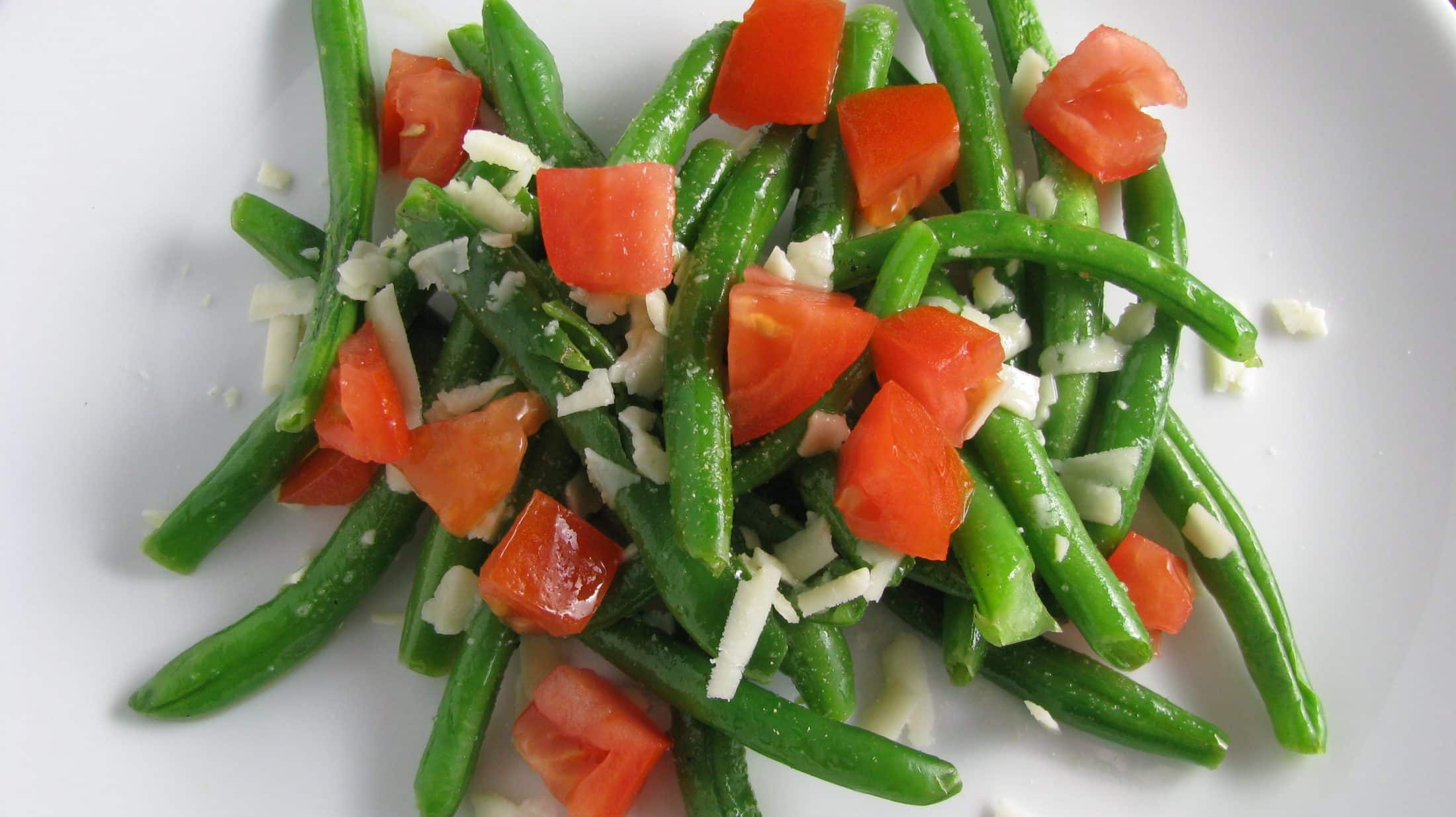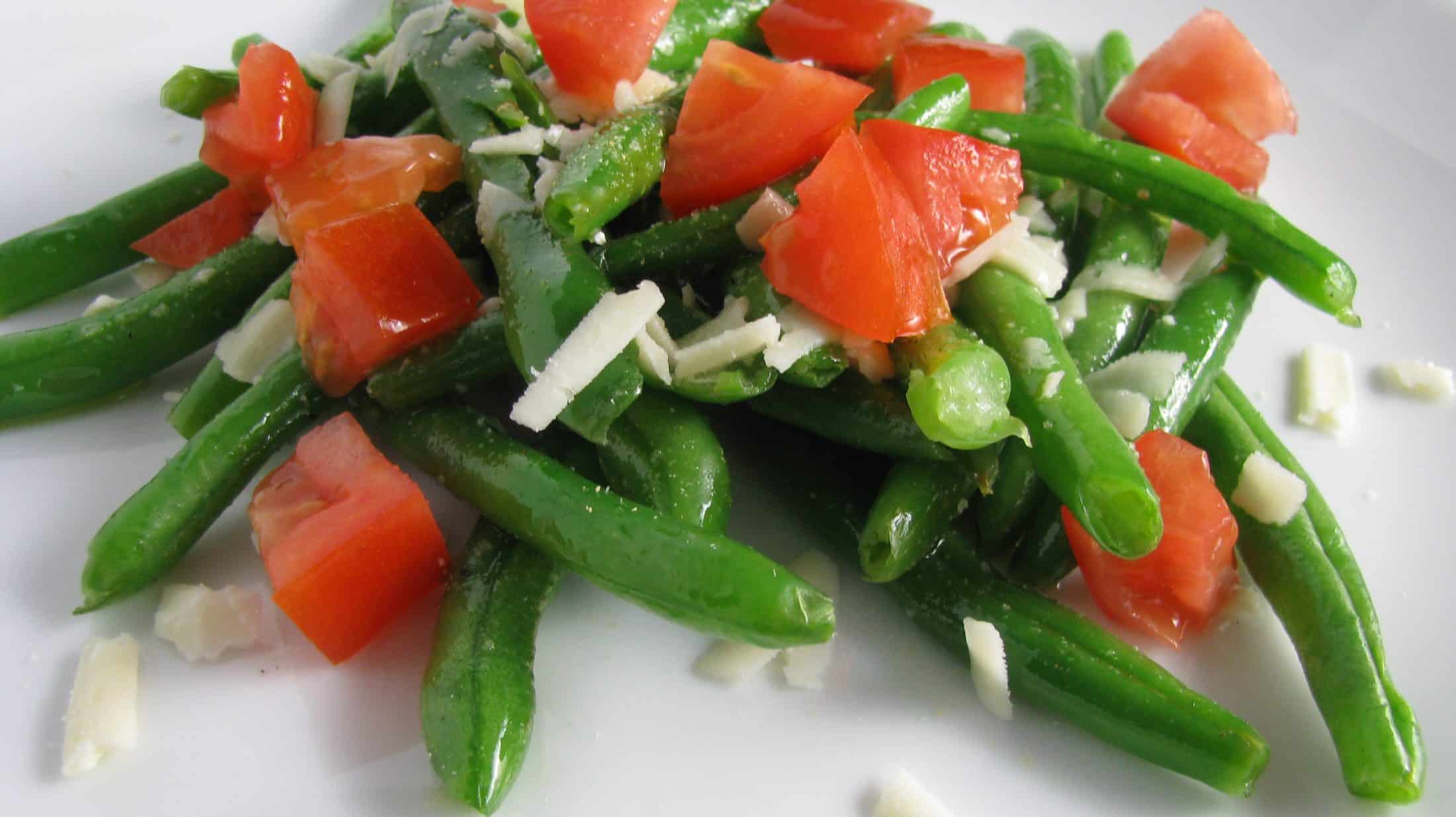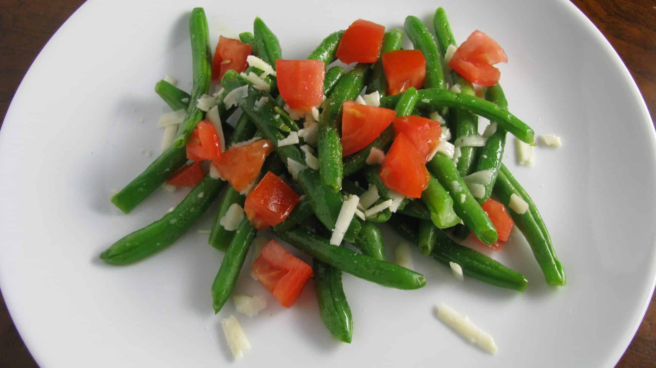 Prepare green beans as desired (I steamed mine). In a large bowl toss green beans and tomatoes with olive oil, garlic, salt, and pepper. Top with shaved parmesan.