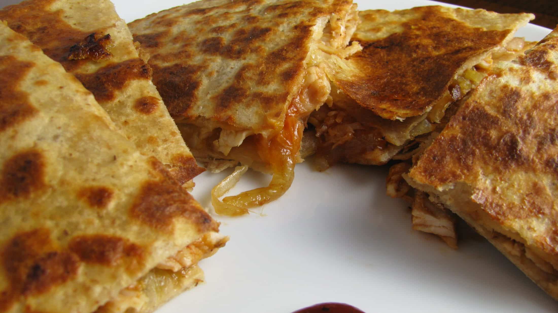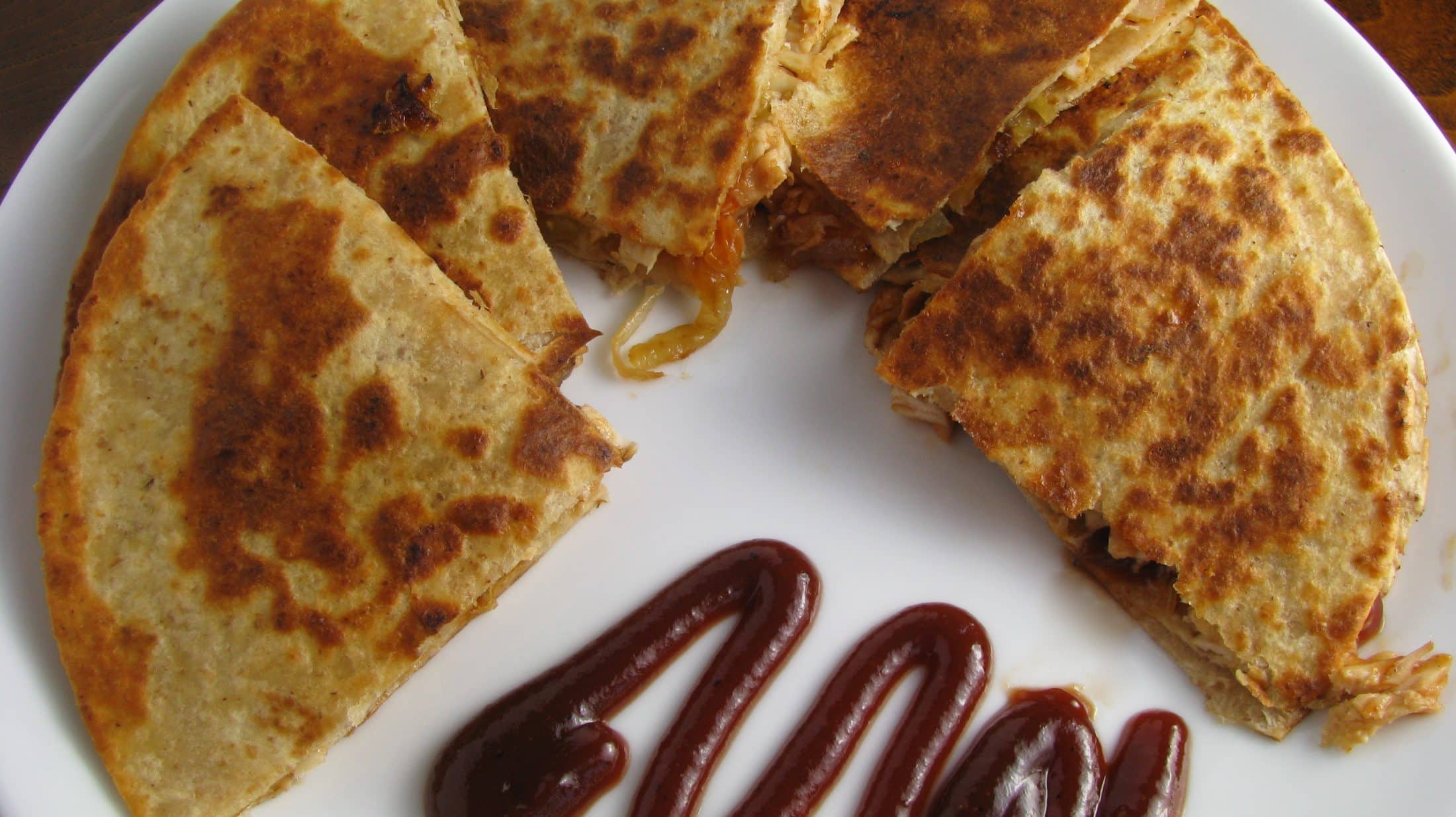 This specific quesadilla is loaded with caramelized onions, chicken, two kinds of cheese and barbeque sauce, with a little extra for dipping.