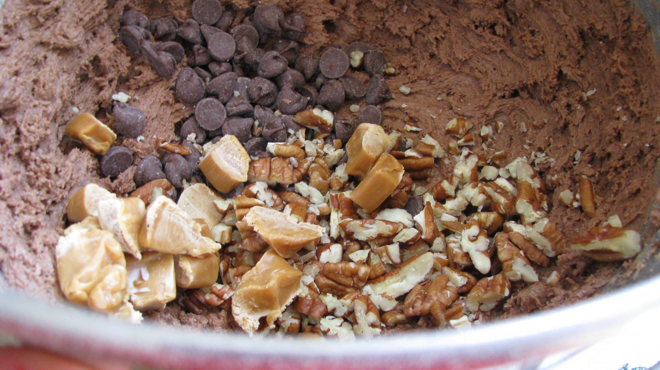 • Fold in pecans, caramel pieces and chocolate chips. Refrigerate dough for 4-6 hours (or more). When ready to bake, preheat oven to 350, roll into balls and set on baking sheet. (Note: refrigerating is the most important part. If you don’t refrigerate, when the cookies go into the oven, the caramel pieces will sink to the bottom and stick to the cookie sheet.)