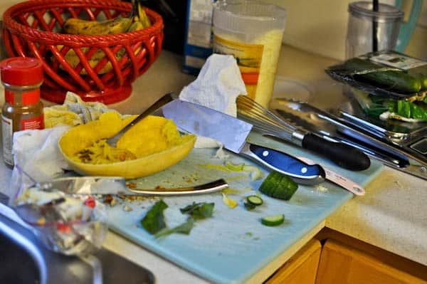 Mr. How Sweet is a perfectionist. I am very Type A, but Mr. How Sweet makes me look… Type Z. And it drives him crazy when the kitchen is a mess. I tell him that he should be happy when the kitchen is a mess, because that means he has indulged in a home cooked meal. He just looks at me. And what’s so funny is that I actually enjoy cleaning the kitchen. But trust me, that is the only place I ever clean up. I’m a disgrace.