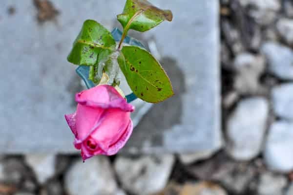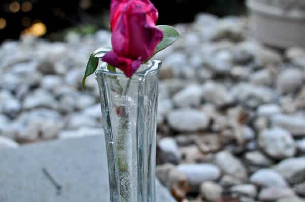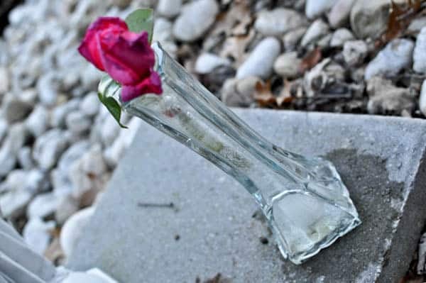 My dad has this Blessed Mother statue outside with a tiny vase and rose to honor my grandmother. It was hers before she passed away, and he has continued the tradition since she left us in February. It was still in the 60’s here last week, so that week’s rose was still hanging in there. But this weekend the frost hit, and the water froze. I thought it looked so cool.