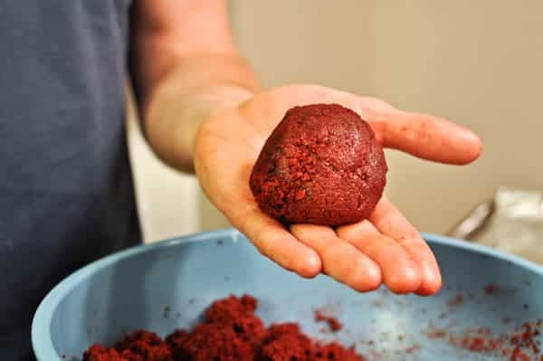 [Mr. How Sweet loves red velvet cake balls. He has been talking about them all year. So I decided to “let” him roll the balls.]