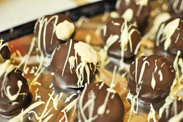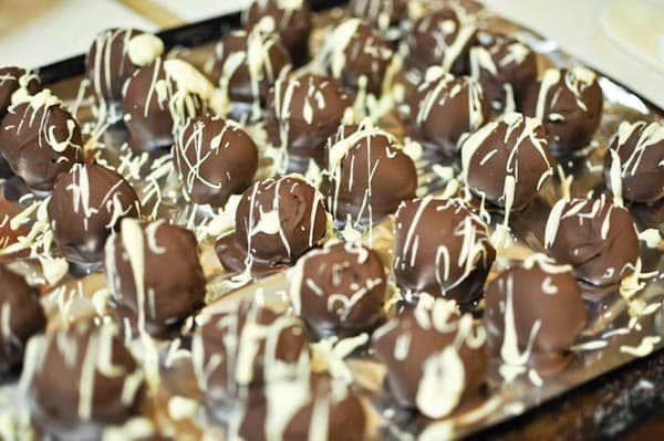I actually use a fork. First, I make sure they are super cold – either straight from the fridge or the freezer. I use a double boiler to melt the chocolate, then dip each ball with a fork, kind of twirling it until its covered in chocolate. Then set on wax paper – when they are finished I put them all back in the fridge.