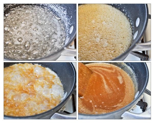Mix water and sugar in a saucepan and heat over low heat without stirring until sugar dissolves. Increase the heat to medium-high, allowing the mixture to come to a boil. This will take about 5-7 minutes, and you can occasionally swirl the pan to stir. Once a golden amber color, remove heat and add cream, vanilla and salt – it will bubble up. Turn heat back down to low and stir continuously until mixture is smooth. Remove from heat and let sit at room temperature for 2-4 hours where it will thicken.