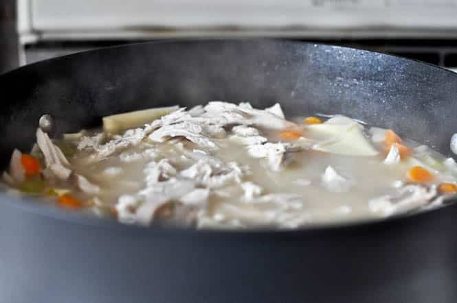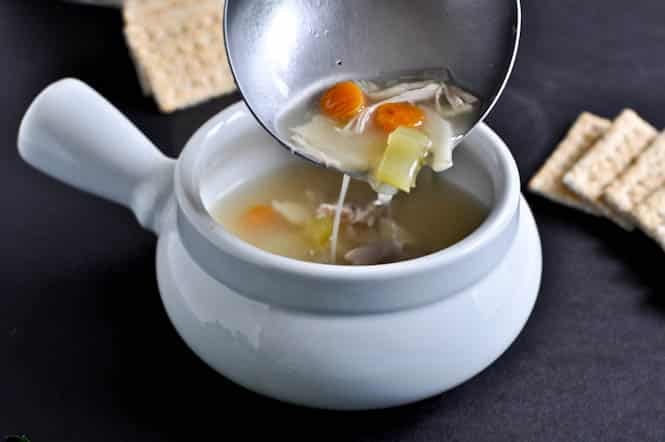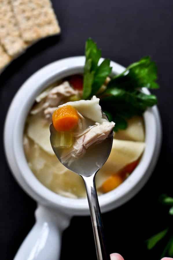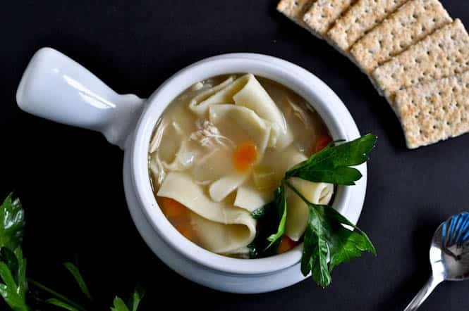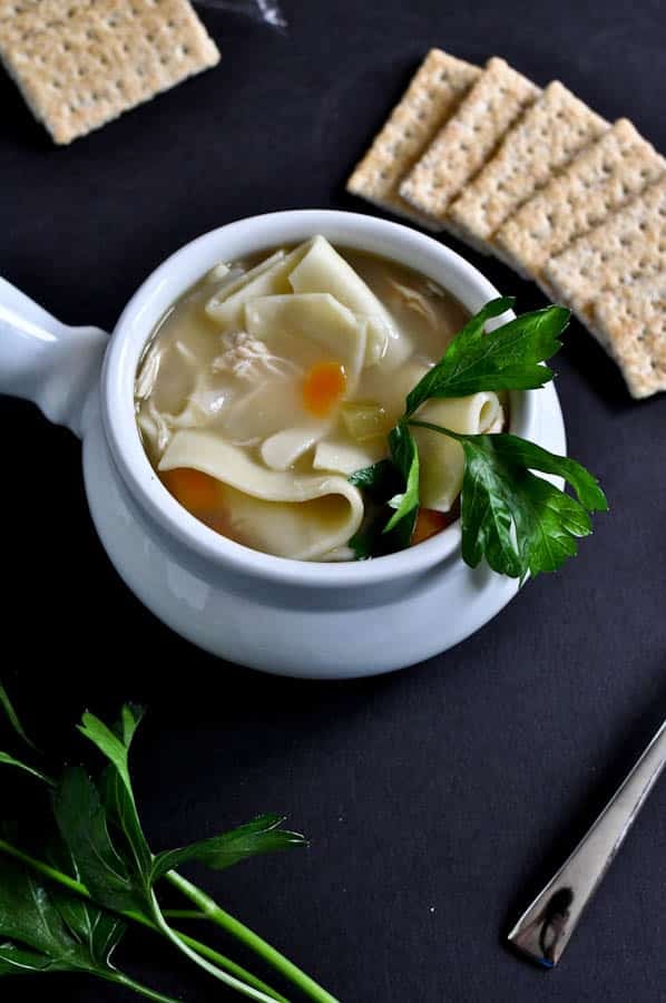 Add chicken into the stock and turn down to low. Stir in 1 1/4 teaspoons of salt (or as much as you’d like) and 2 teaspoons of pepper. I cooked mine on low for about 2 hours, but it was easily ready to eat and flavorful after 30 minutes. Add noodles about 15 minutes before serving. Serve hot with crackers and a garnish of fresh herbs.