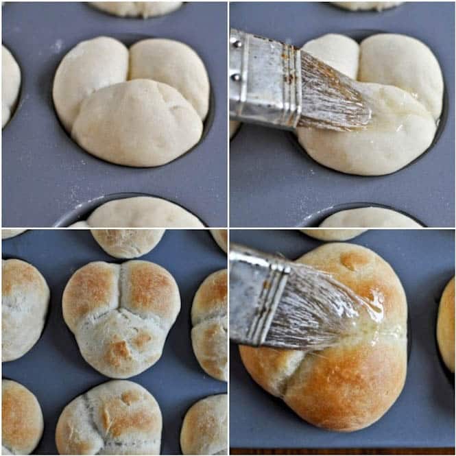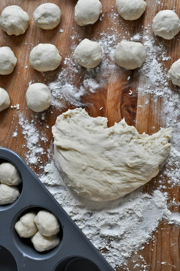 - Brush a large bowl with melted butter. Add dough to the bowl, turning once or twice to cover in butter. Place a towel over top and let rise in a warm place for 1 1/2-2 hours. Punch dough down, then transfer to a floured workspace. Tear small pieces of dough off the larger piece, and roll into balls slightly larger than one inch wide. You will end up with about 90 dough balls. Brush a muffin tin with melted butter, then add 3 dough balls to each tin. Cover and let rise again, in a warm spot, for about an hour.