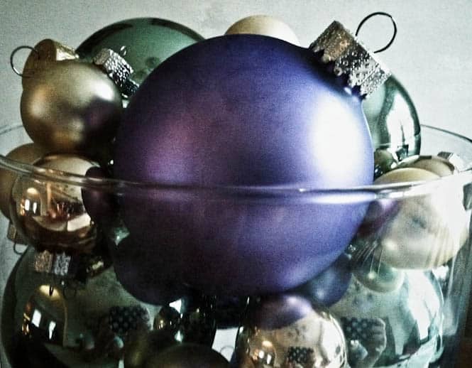 But I attempted this last night… just threw some matte purple and mint green ornaments in a big glass… thing?… and then added some tiny champagne and gold ones in there too.