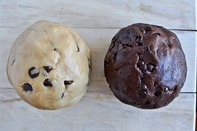 **You have two options here to make the dough. You can make two separate half batches of the recipe below in two different bowls (recommended if you don’t have a kitchen scale). Or, you can make the dough as calls for through adding the egg and vanilla extract. Then use a kitchen scale, measure it in grams, put an equal amount in each bowl, then make chocolate chip in one bowl and double fudge chip in the other. The latter is what I did and how I’m writing the recipe.**