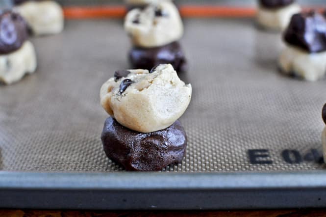 Roll each dough into 12 balls (about an inch thick) so you end up with 24. As demonstrated in the rainbow cookies, pull each ball apart. Take one chocolate chip half and one double fudge half, placing the round ends together with the rough edges out like in the second picture. Place dough rough-side down on a non-stick baking sheet about 1 1/2-2 inches apart.
