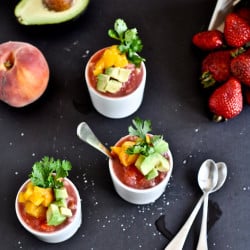 You know I’m all about trashing up the classics, and this one – topped with creamy avocado chunks, lots of salt, fresh peaches and a bunch of cilantro (don’t be a hater) – is one of my current favorites. I don’t think I can call it soup… but we’ll see how this relationship progresses.