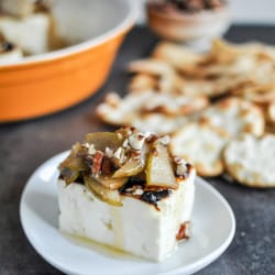 - Cover the feta with the pears (and any sauce/juice in the pan), the pecans and the honey. Serve immediately with pita chips, crackers, fruit or vegetables.