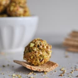 - Roll the goat cheese into 1/2-1 inch balls (or smaller or larger, depending on your preference), then roll through the pistachios to coat. Set on a plate and refrigerate for at least 30 minutes before serving. These can be made well ahead of time – I’d say at least about 3 days.