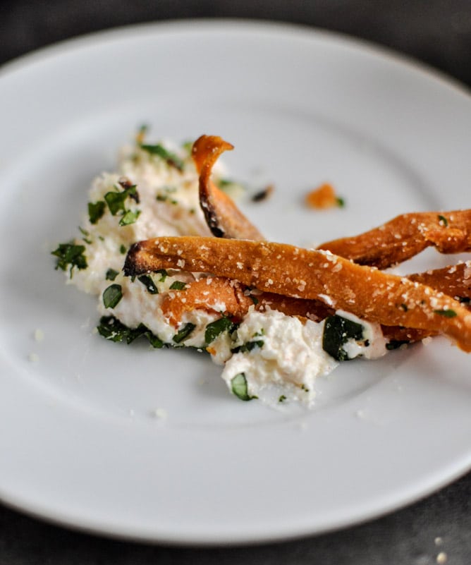 Oooh, I had zucchini fries with a feta dip at a restaurant in Leesburg, VA back in the fall. I bet it would be awesome with sweet potato fries as well!