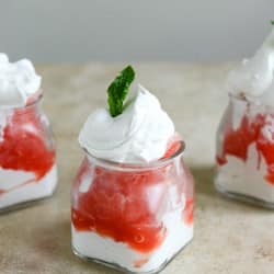 - When ready to serve, open the can of cold coconut milk and discard (read: use it for something else, don’t pitch it!) all of the liquid. Scoop the cream into the bowl of an electric mixer and beat on high speed with a whisk attachment until peaks form, about 2 minutes. If desired, you can sweeten your coconut whipped cream with a little sugar. Serve the granitas by layering a spoonful of the whipped cream, the granitas and more whipped cream. Add a spring of mint if you wish!