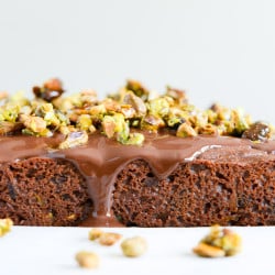 • Melt the chocolate chips in a doubler boiler or in the microwave. Once they are melted, stir in the coconut oil until it’s melted. Remove the cake from the pan once it has cooled slightly and pour the chocolate overtop. Cover the chocolate with the chopped pistachios. Slice and serve!