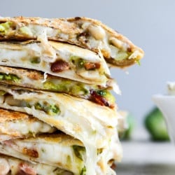 - Heat a large electric griddle or skillet (or even the same skillet, just empty it) over medium-low heat. To assemble the quesadillas, add a little smoked mozzarella on one side of each tortilla then cover evenly with the bacon brussels mixture. Top both with the remaining cheese and tortilla. Add a little olive oil or butter to the skillet and place the tortilla in once it’s melted. Cook until the outsides are golden brown and crisp and the cheese has melted, about 3 minutes per side.