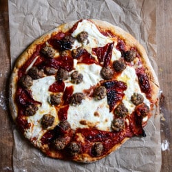 Nothing too crazy about the rest of this pie – just some of my mini meatballs (you could sub turkey, chicken, lamb – whatever), mozzarella and red peppers. I’m currently watching Eddie shove the last leftover slice into his face. Pretty sure that actual meatballs on pizza is a dream meal for him.